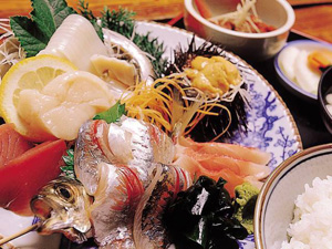 毎日漁場に行って獲ってくる新鮮な魚貝類で造り6種類以上が味わえる刺身定食・平目の薄作りは絶品